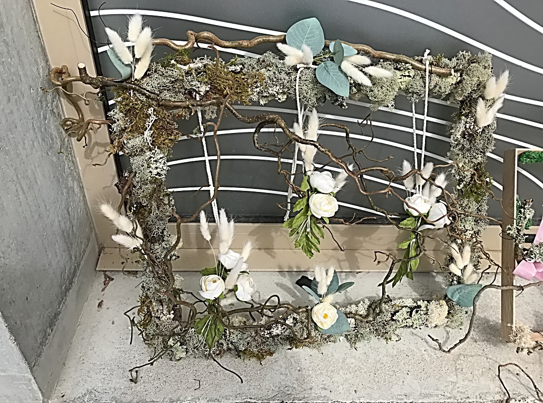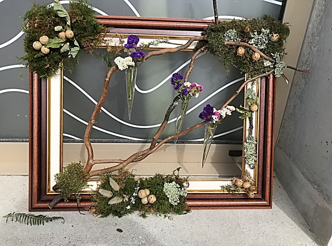 Notre création était sur la base d’un cadre en bois. Des branches de saules tortueux, des bois flottés, de la mousse, du lichen et des écorces de bois ont été placés tout autour et au centre de notre cadre.