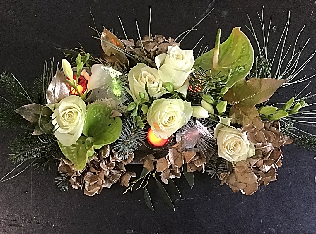 De belles roses blanches, des anthuriums verts et des freesias blancs sont venus sublimer notre composition.