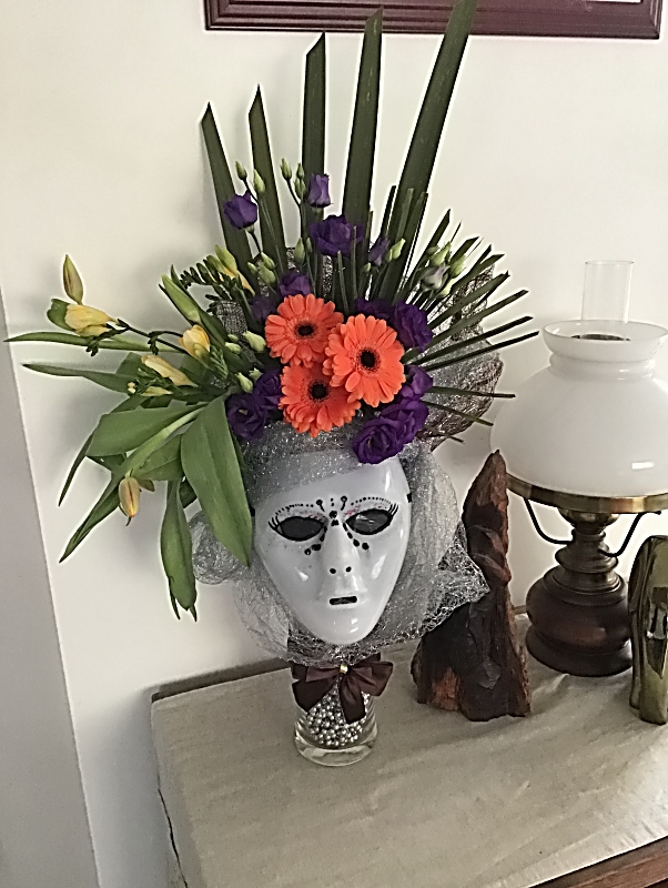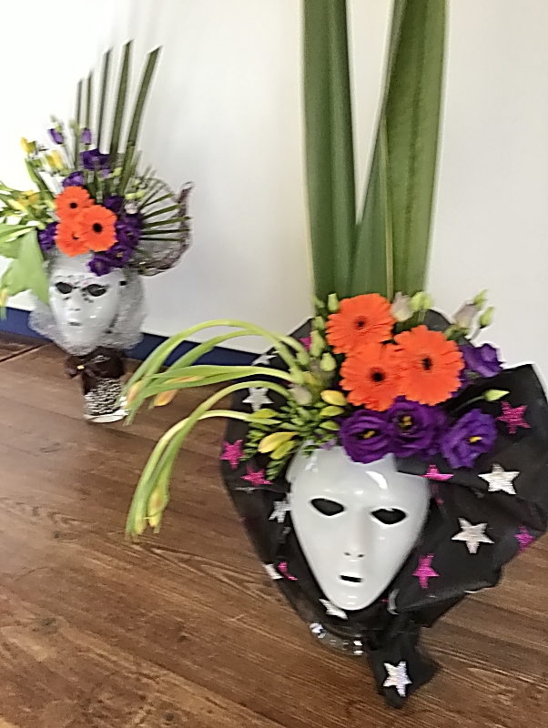 Un masque à été placé à la base du vase et un morceau de tule fixé en hauteur. Des végétaux et des fleurs ont été piqués sur notre mousse.