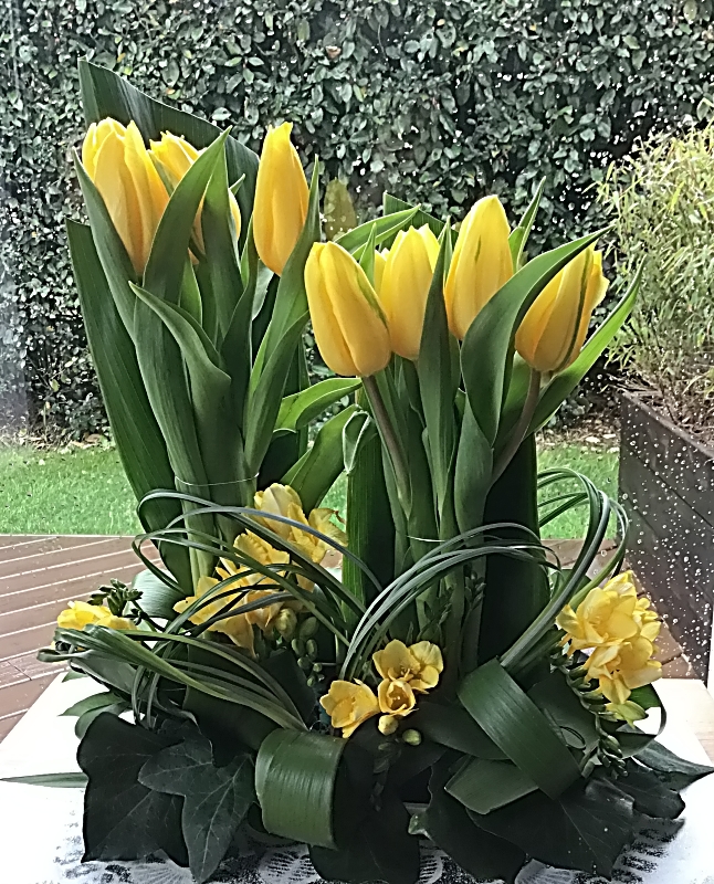 - Deux bouquets de tulipes de hauteurs différentes, pour donner un caractère graphique à la composition.