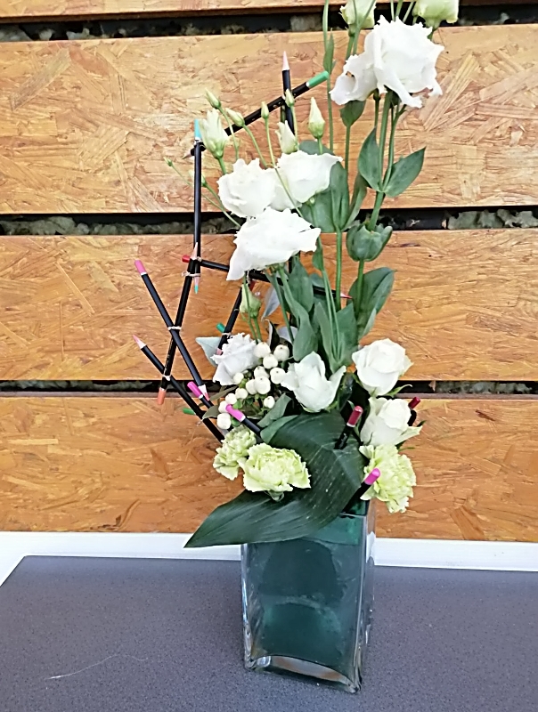 Notre création avait pour base, des crayons de couleurs, pour donner encore plus de couleurs et nous rappeler des souvenirs lorsque nous étions en classe. Nous l’avons ensuite placée sur le côté de notre mousse florale.