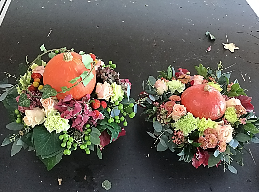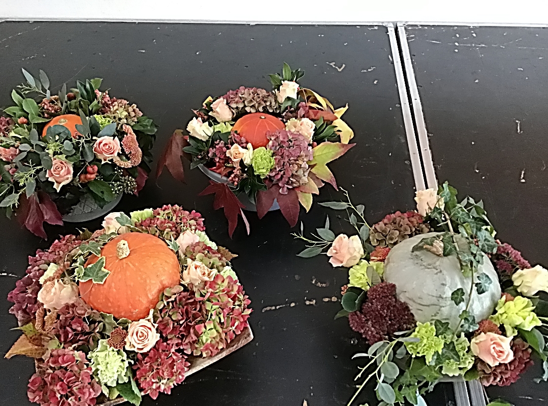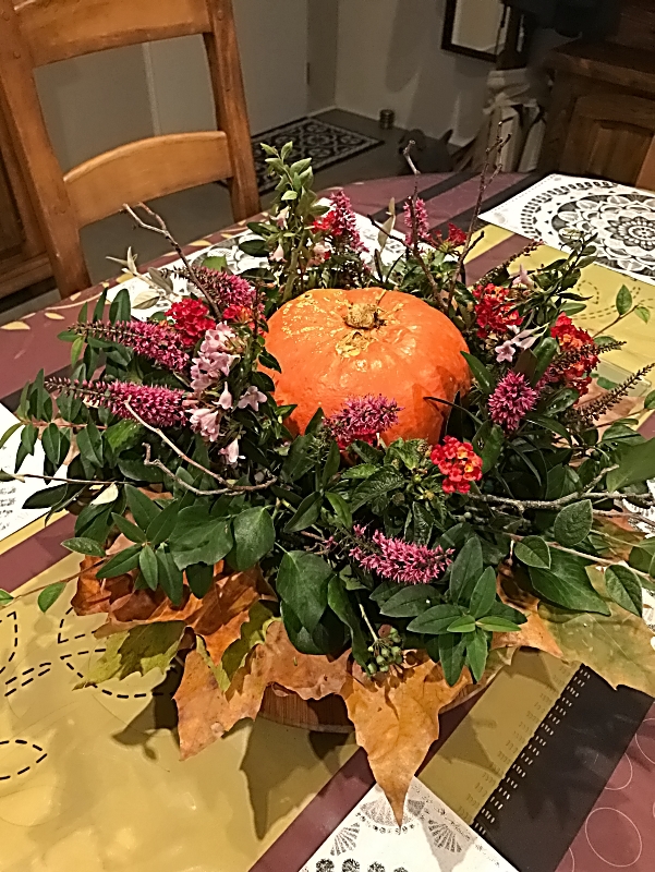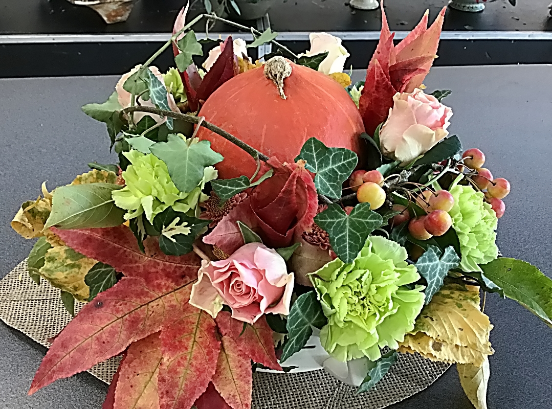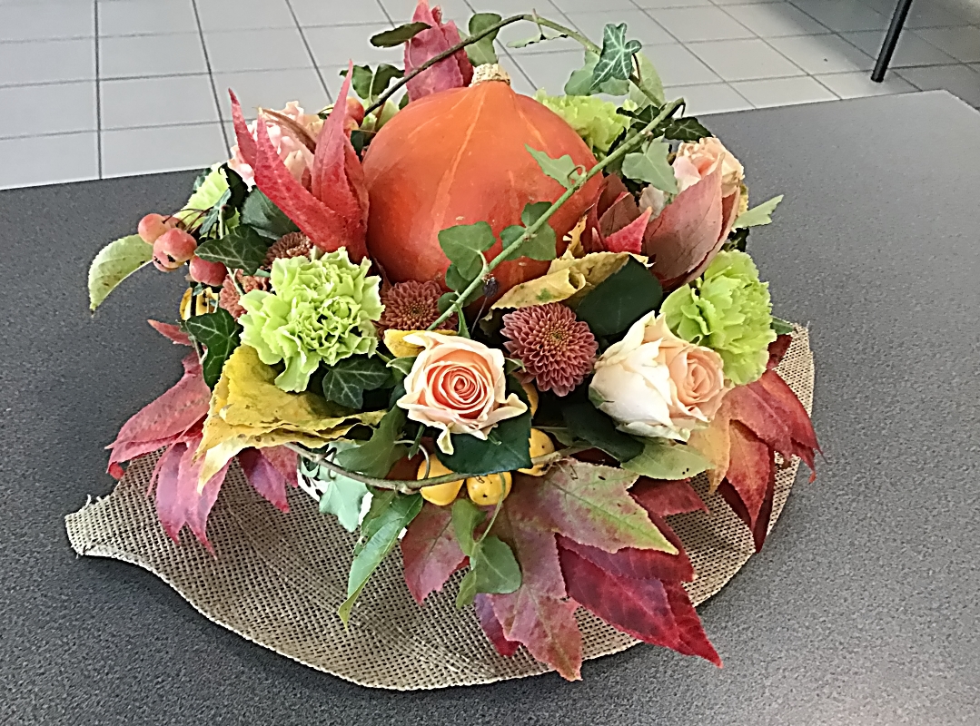 Une petite découpe avait été faite au centre pour y placer un petit potiron. Des oeillets, des hortensias, des roses, des mini chrysanthèmes, des feuilles d’eucalyptus ou autres végétaux ont été placés tout autour de notre potiron.
