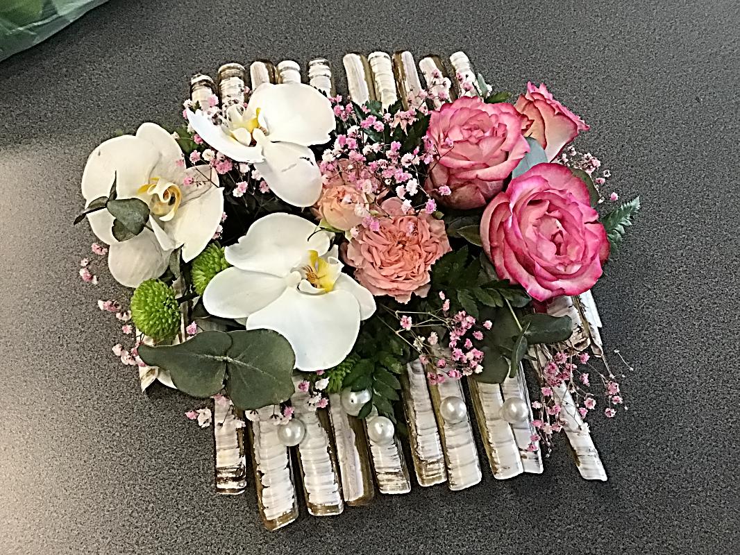 Sur l’un des côtés nous positionné 3 roses (ou autres fleurs ) et de l’autre côté des orchidées.
