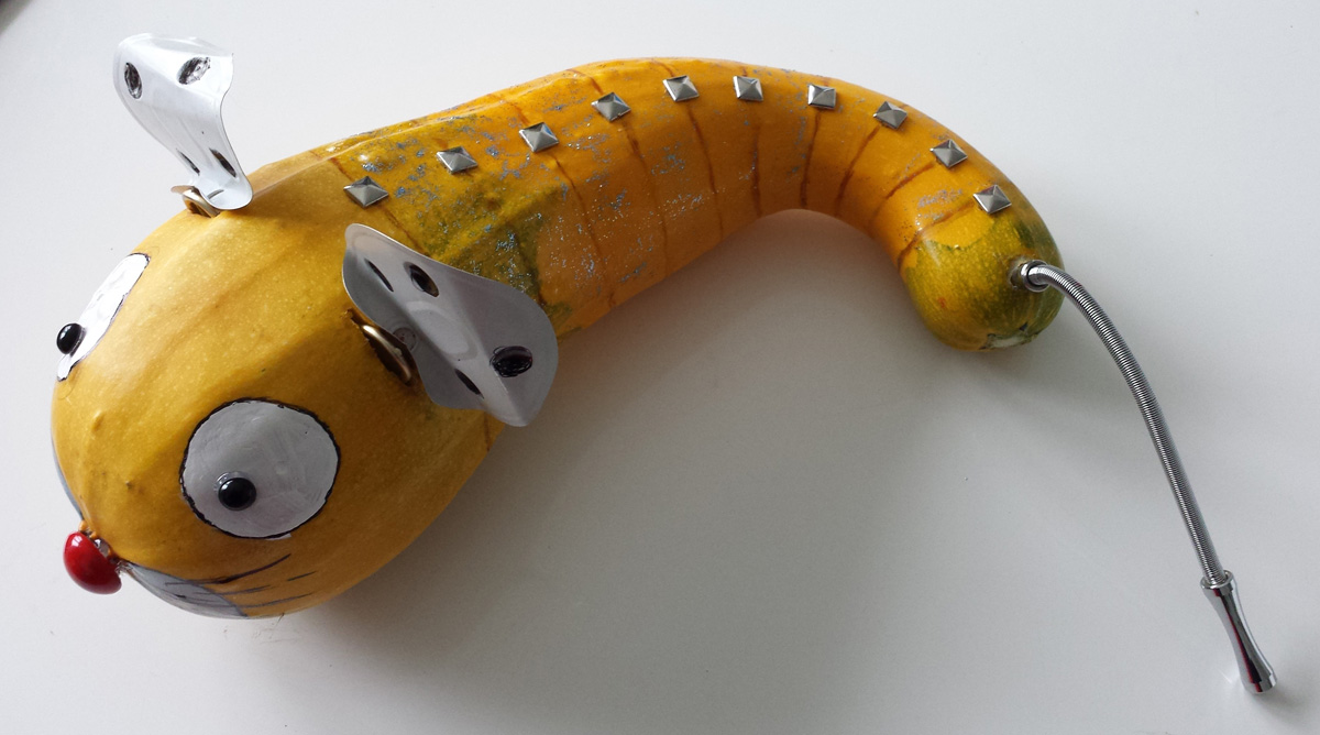 Ces exemples sont faits pour être vus de jour. A base de peinture, collages, incrustations, afin de vous donner des idées d’objets que vous pouvez ramener de chez vous qu’on pourra incruster, coller, etc Ici, pour les oreilles, ce sont des couvercles de boite de conserve. Des clous à rivets sur le dos, de la peinture blanche pour les yeux et le museau, du feutre pour les moustaches et des perles collées pour le nez et la pupille des yeux. Pour la queue, un épilateur manuel, un stock que j’ai récupéré et que je gardais au cas-où...