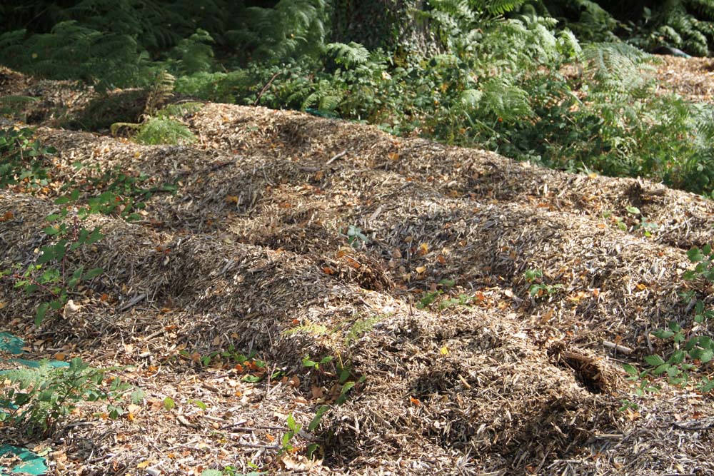 Paillage avec le BRF (bois raméal fragmenté), à mélanger avec la tonte et laisser décomposer quelques mois avant usage (OK quant il y a des mycorhizes =blanc de champignons à fonction nourricière.