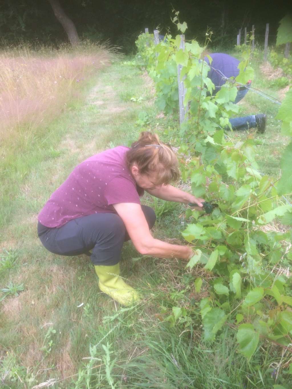 Nous avons pu apprendre, avec Patrick Laurilleux, l’épamprage qui consiste à dégager les pieds de vigne des feuilles inutiles et de retirer les petits gourmands pour les aérer et de garder les branches fructifères sur la tête de souche pour la taille d’hiver.