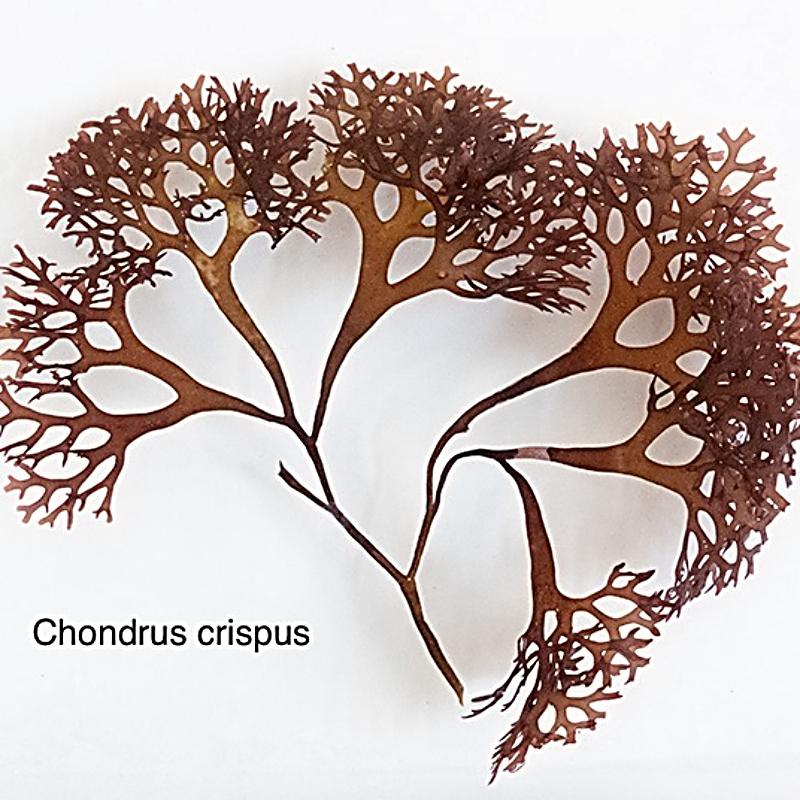 Chondrus crispus ( Goémon blanc )Cette algue rouge, très polymorphe d’aspect, mesure en général entre 7 et 15 cm de long. Sa couleur varie de pourpre à vert en passant par le brun, avec de nombreuses nuances intermédiaires. Elle est récoltée pour ses propriétés gélifiantes .