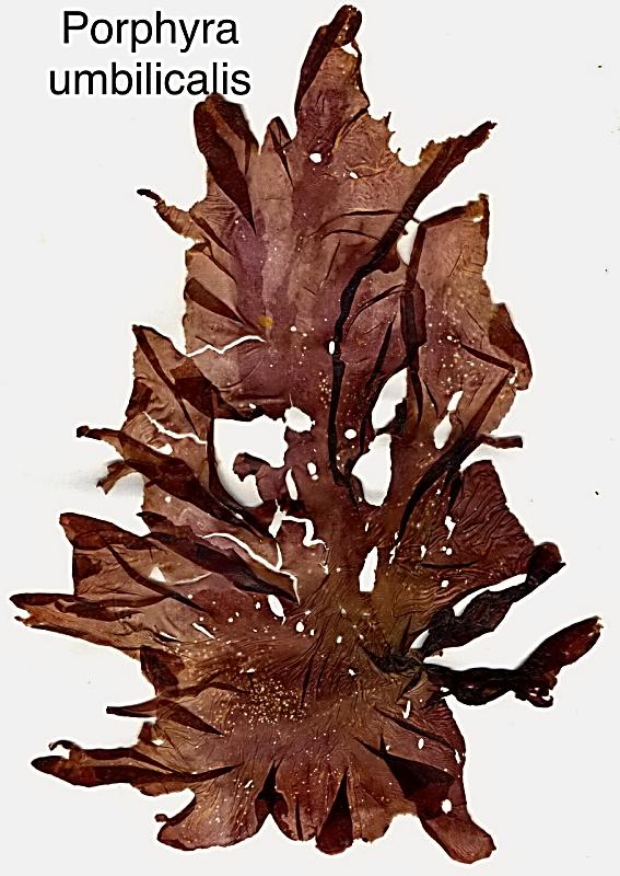 Porphyra umbilicalis (Nori) C’est une algue très fine dont les lames lobées peuvent atteindre jusque 60 cm de longueur. Douce, à la saveur noisette, la Nori est l’algue la plus mangée de nos jours.