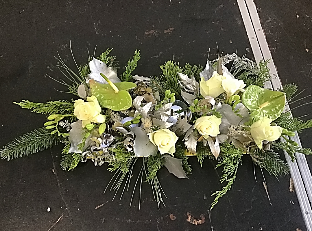De belles roses blanches, des anthuriums verts et des freesias blancs sont venus sublimer notre composition.