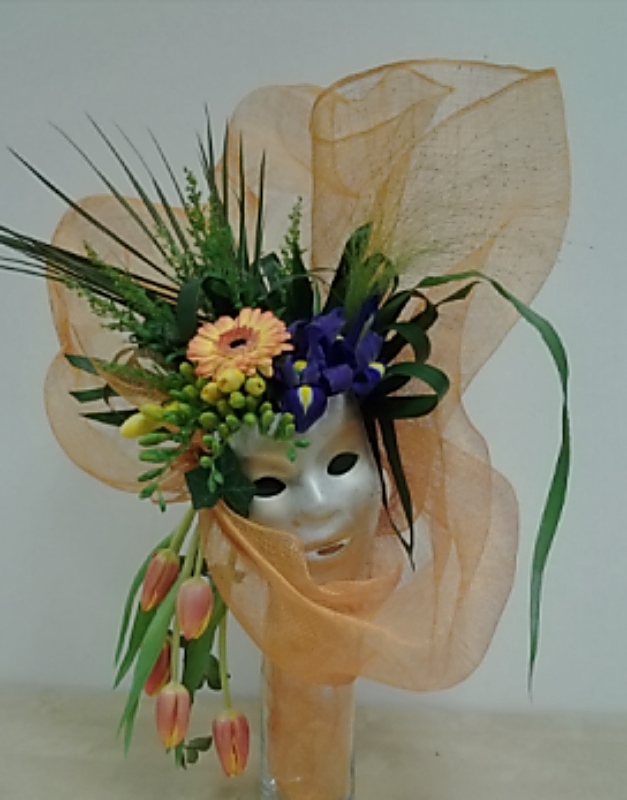 Un masque à été placé à la base du vase et un morceau de tule fixé en hauteur. Des végétaux et des fleurs ont été piqués sur notre mousse.