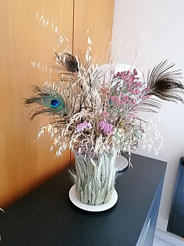 Ensuite nous avons commencé par habiller notre contenant tout en collant tout autour des brins de blé et des herbes séchées, puis nous avons commencé notre bouquet (en rond) toujours avec des herbes et quelques fleures pour donner un peu de couleur et nous avons déposé notre bouquet dans notre vase, très jolie résultat.