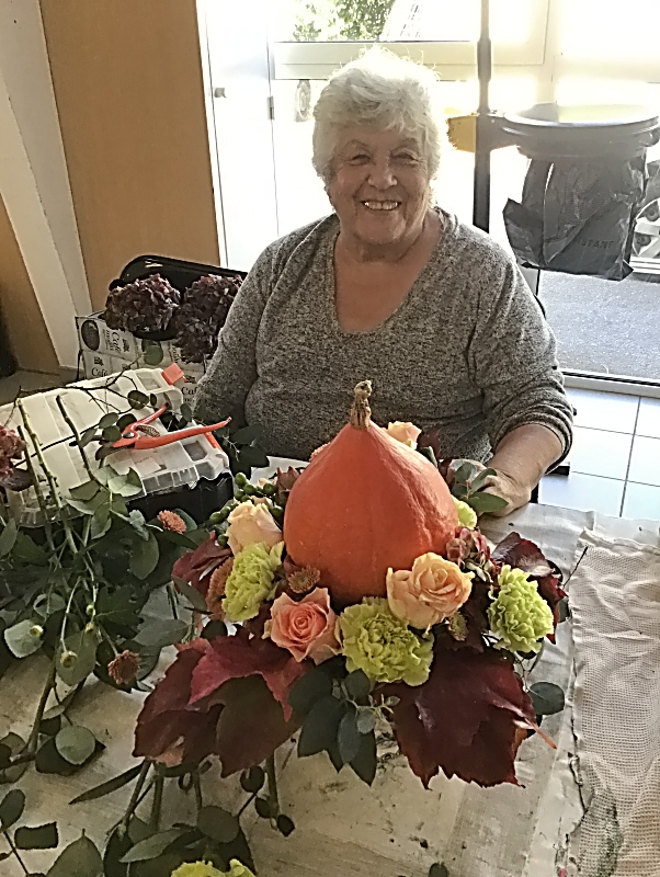 Une petite découpe avait été faite au centre pour y placer un petit potiron. Des oeillets, des hortensias, des roses, des mini chrysanthèmes, des feuilles d’eucalyptus ou autres végétaux ont été placés tout autour de notre potiron.