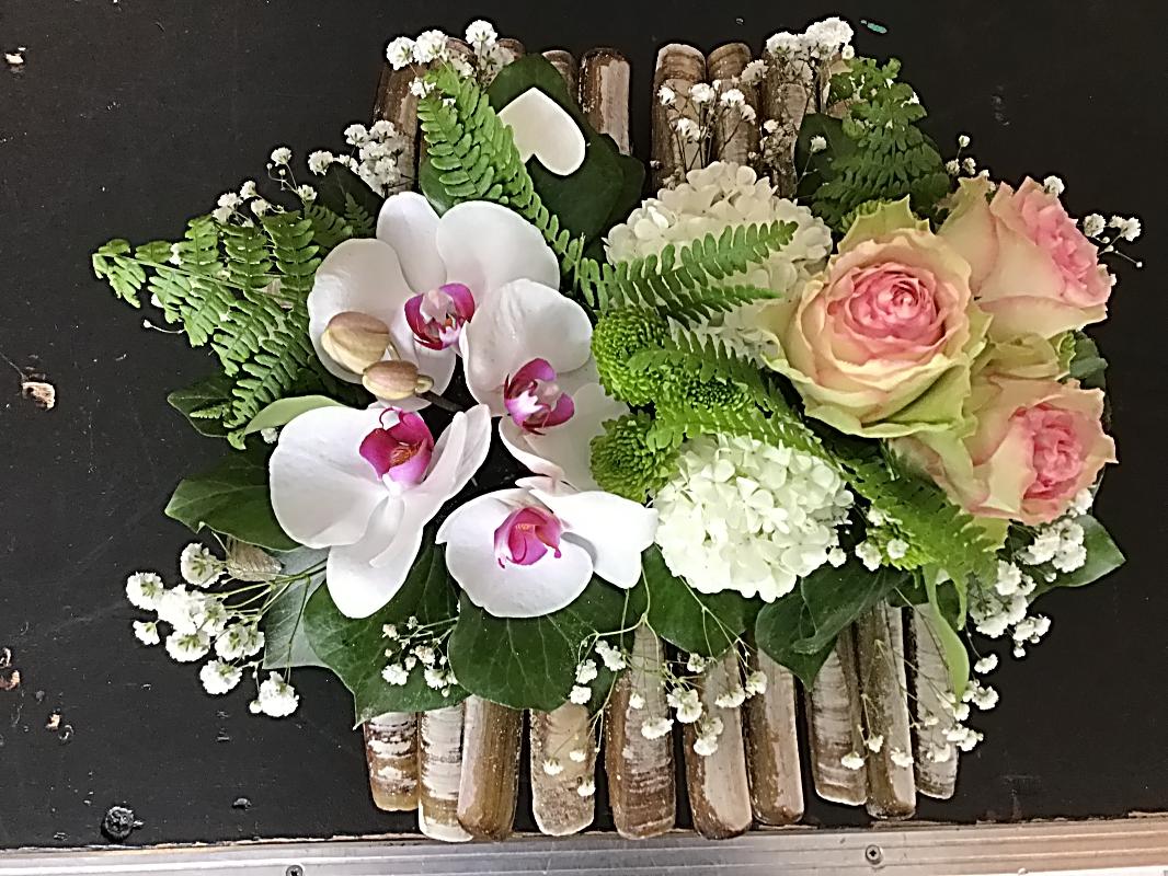 Sur l’un des côtés nous positionné 3 roses (ou autres fleurs ) et de l’autre côté des orchidées.