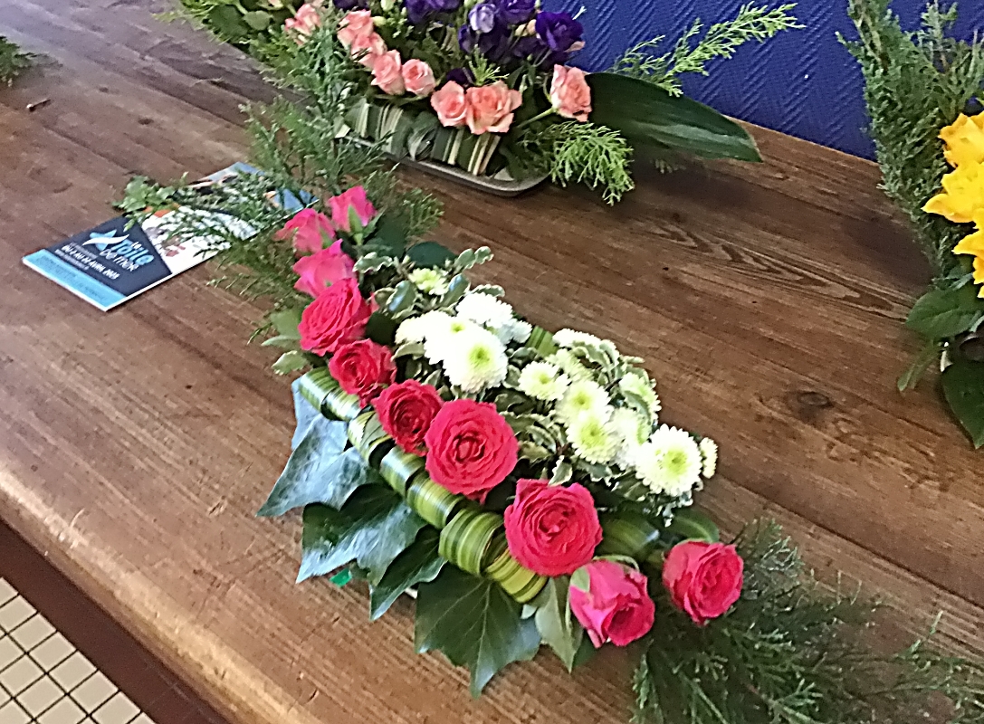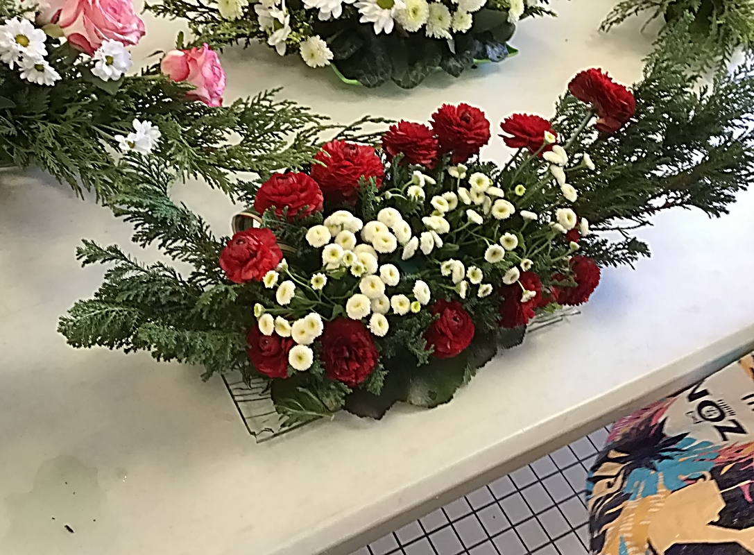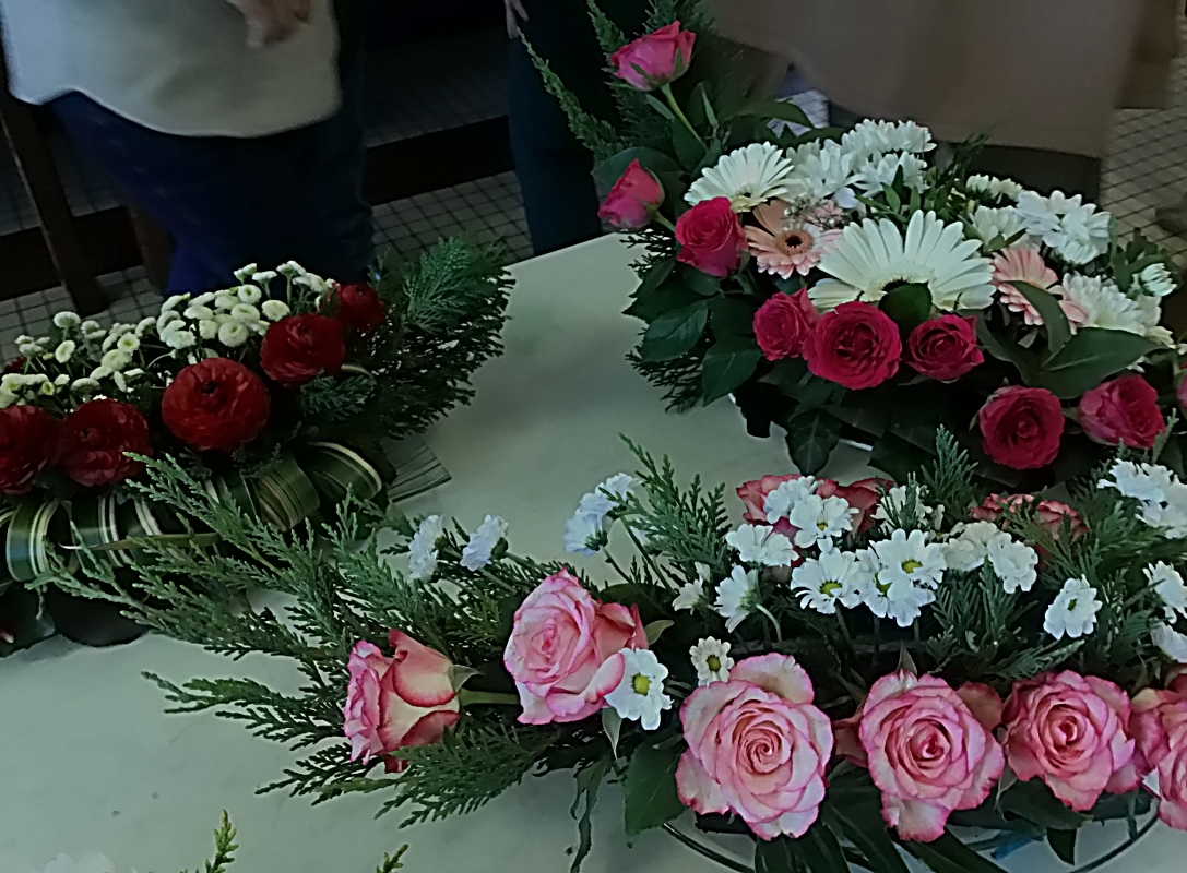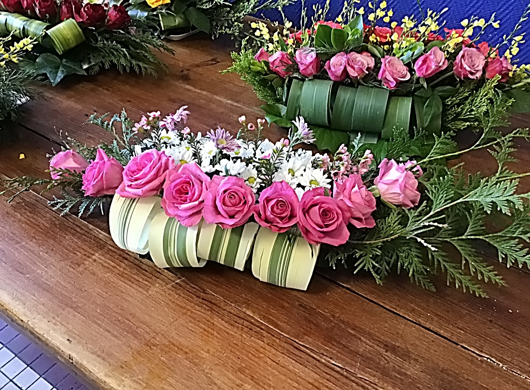 Des branches de Cupressus, des feuilles de Pandarus ont été placé sur notre base. Des roses ont été piqué sur toute la longueur de notre mousse, pour terminer nous avons recouvert le reste avec des branches de chrysanthème ou d’autres fleurs de notre choix.