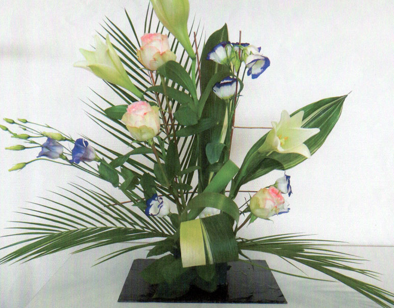 Chaton des plages, 3 petites fleurs rondes type mini œillet , chardon. Quelques feuilles d’eucalyptus ou autre feuillage rigide