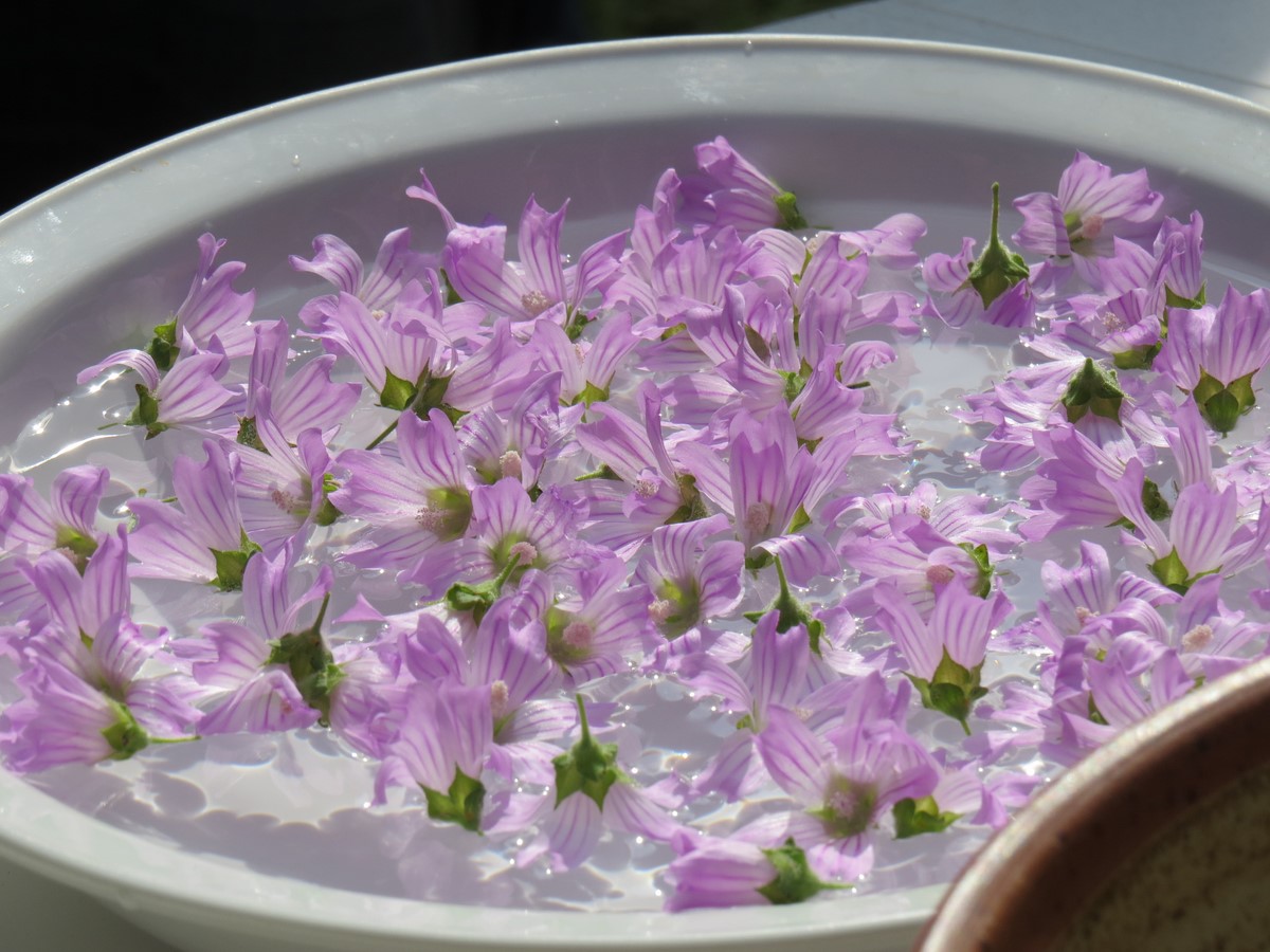 Véronique propose de faire des thés solaires avec une partie des pâquerettes et de mauves que l’on laisse infuser dans des saladiers, dehors, au soleil, sur une table de jardin.