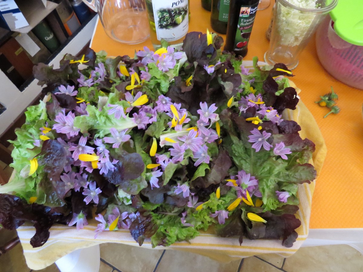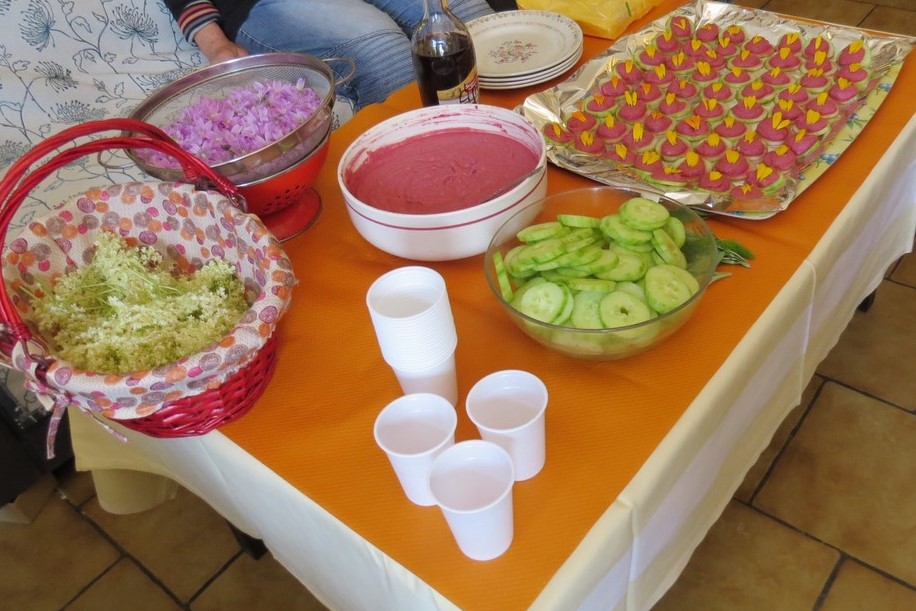 Elle nous a emmené dans le jardin d’une de ses amies, envahi de plantes sauvages, le lieu idéal pour faire notre cueillette de plantes afin de préparer une salade à base de fleurs, du thé solaire aux paquerettes, ainsi que des fleurs de sureau sur le terrain communal en face du jardin.