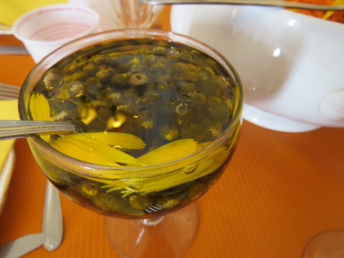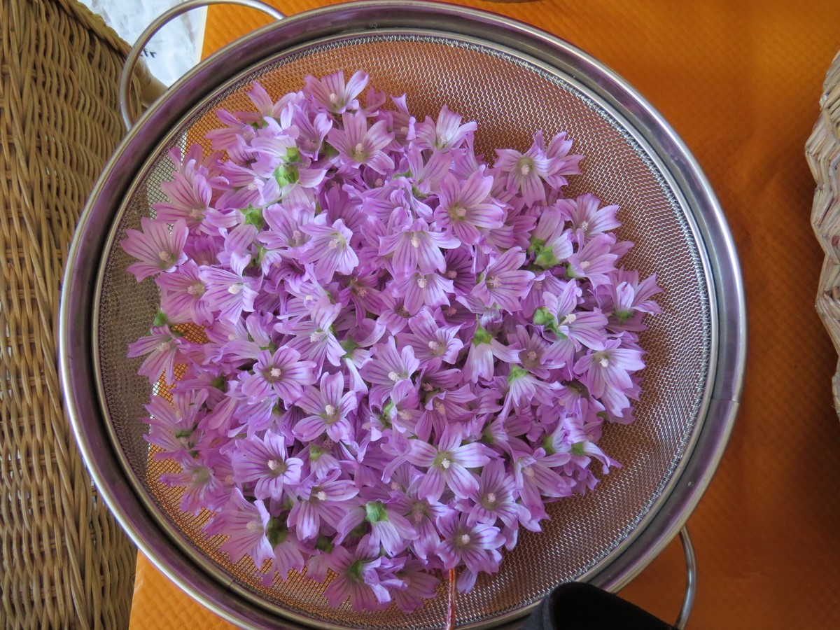 Véronique propose de faire des thés solaires avec une partie des pâquerettes et de mauves que l’on laisse infuser dans des saladiers, dehors, au soleil, sur une table de jardin.