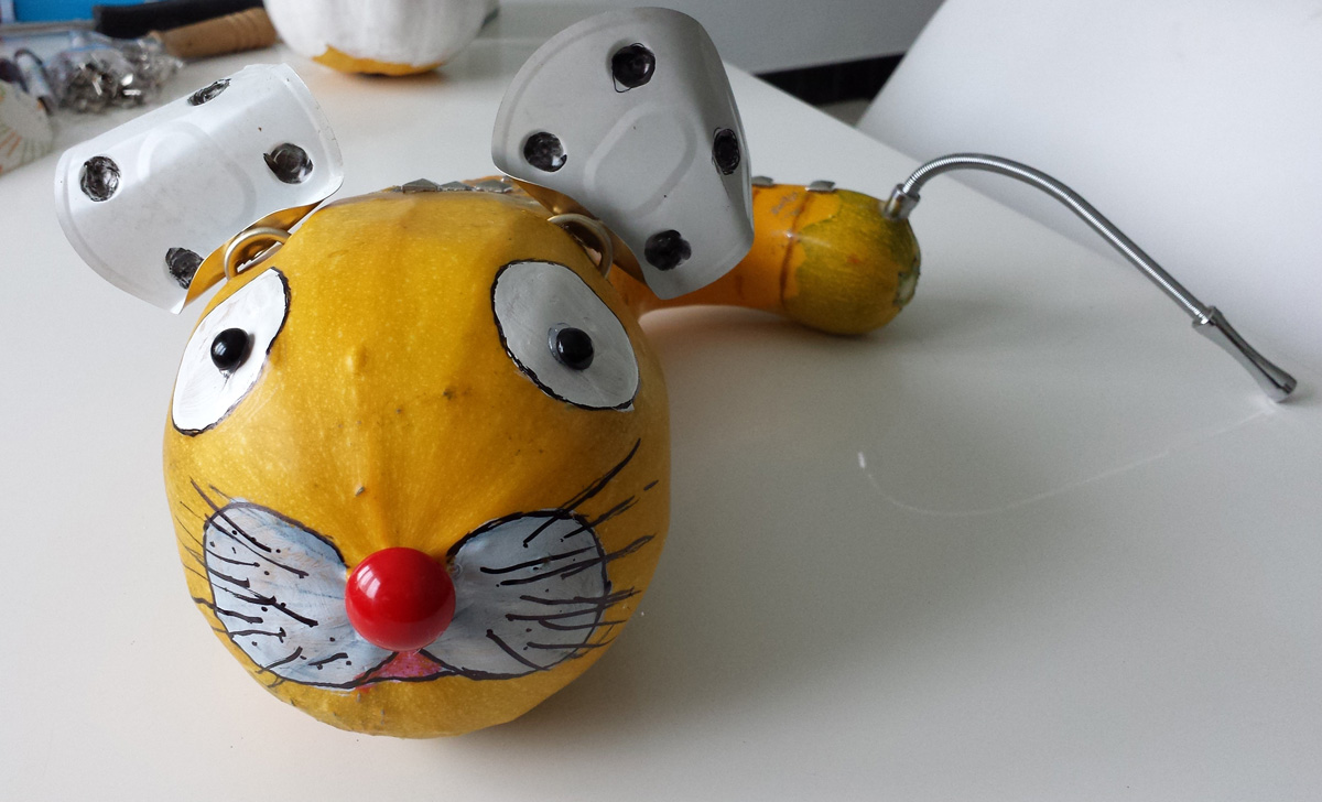 Ces exemples sont faits pour être vus de jour. A base de peinture, collages, incrustations, afin de vous donner des idées d’objets que vous pouvez ramener de chez vous qu’on pourra incruster, coller, etc Ici, pour les oreilles, ce sont des couvercles de boite de conserve. Des clous à rivets sur le dos, de la peinture blanche pour les yeux et le museau, du feutre pour les moustaches et des perles collées pour le nez et la pupille des yeux. Pour la queue, un épilateur manuel, un stock que j’ai récupéré et que je gardais au cas-où...