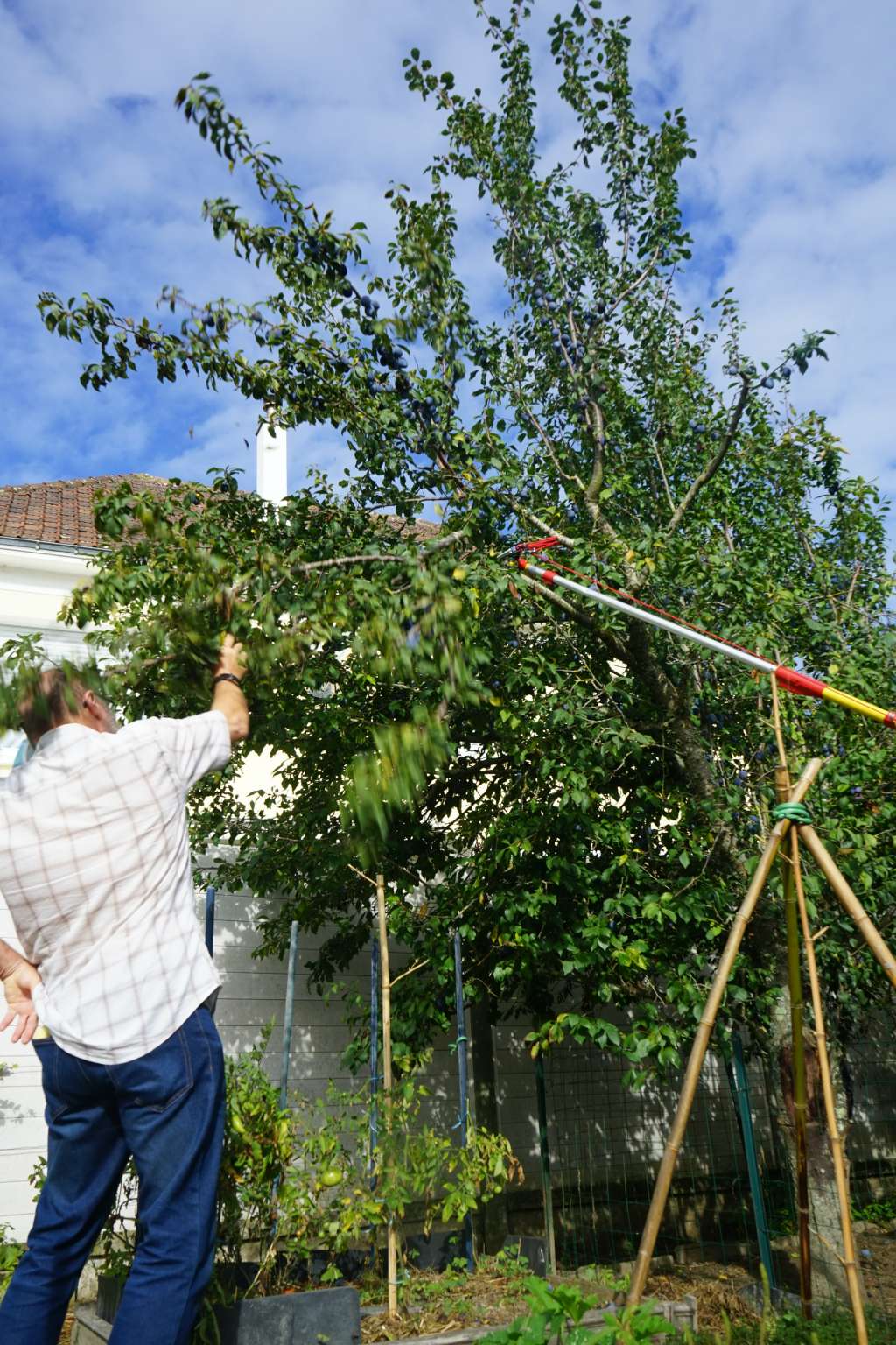Apprendre la tailles des arbres fruitiers à noyaux chez nos adhérents. Philippe, notre intervenant, nous explique le remaniage d’un prunier Reine Claude. Il commence par la nécessité et le choix des branches à éliminer car ce sujet n’a jamais été taillé.